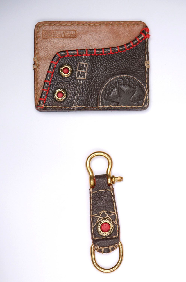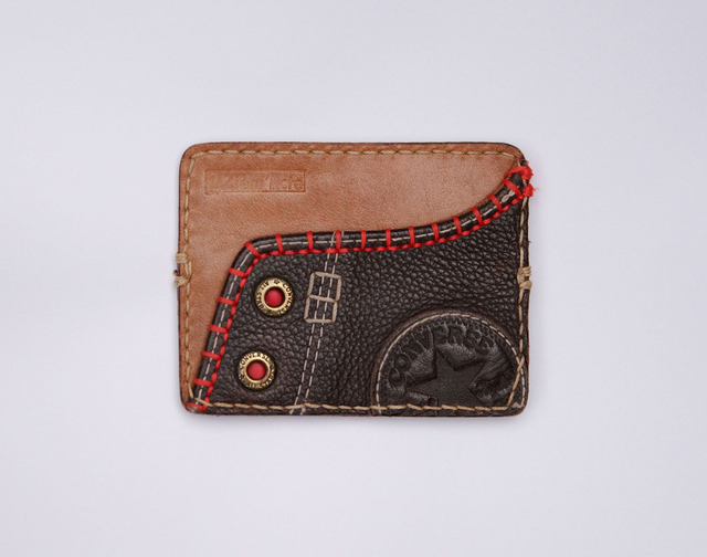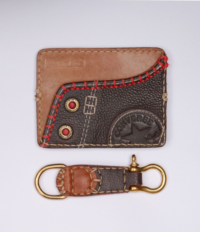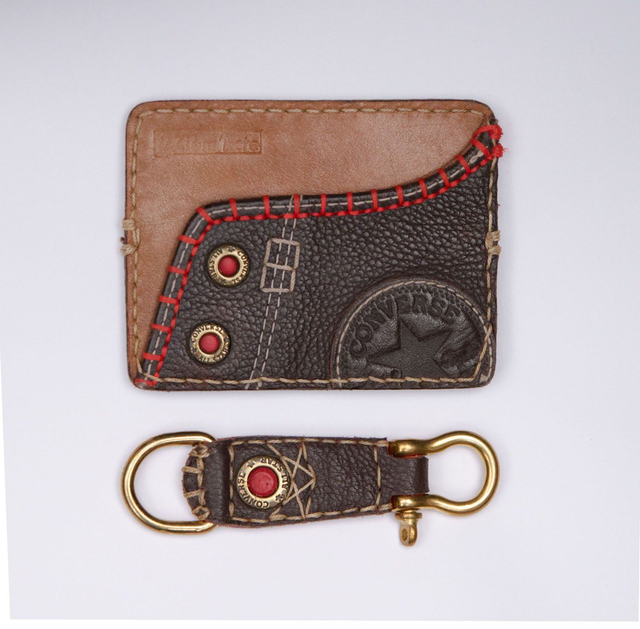 Pochette porte carte bleue, faite à la main à partir de tennis cuir de marque et porte clefs, la pochette est munie de deux espaces de rangement carte bleue (recto / verso: 1 par face)