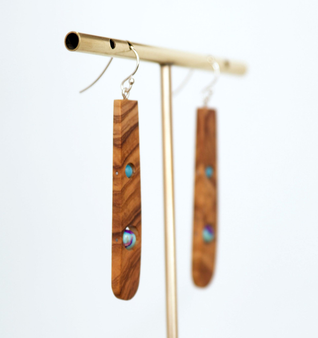 Cette jolie paire de boucles d'oreilles, élancée, est ornementée de long pendants en bois d'Olivier cirés, avec inserts de perles de Jaspe Impérial en sa partie basse, et de perles de Calcédoine bleues en partie supérieure.